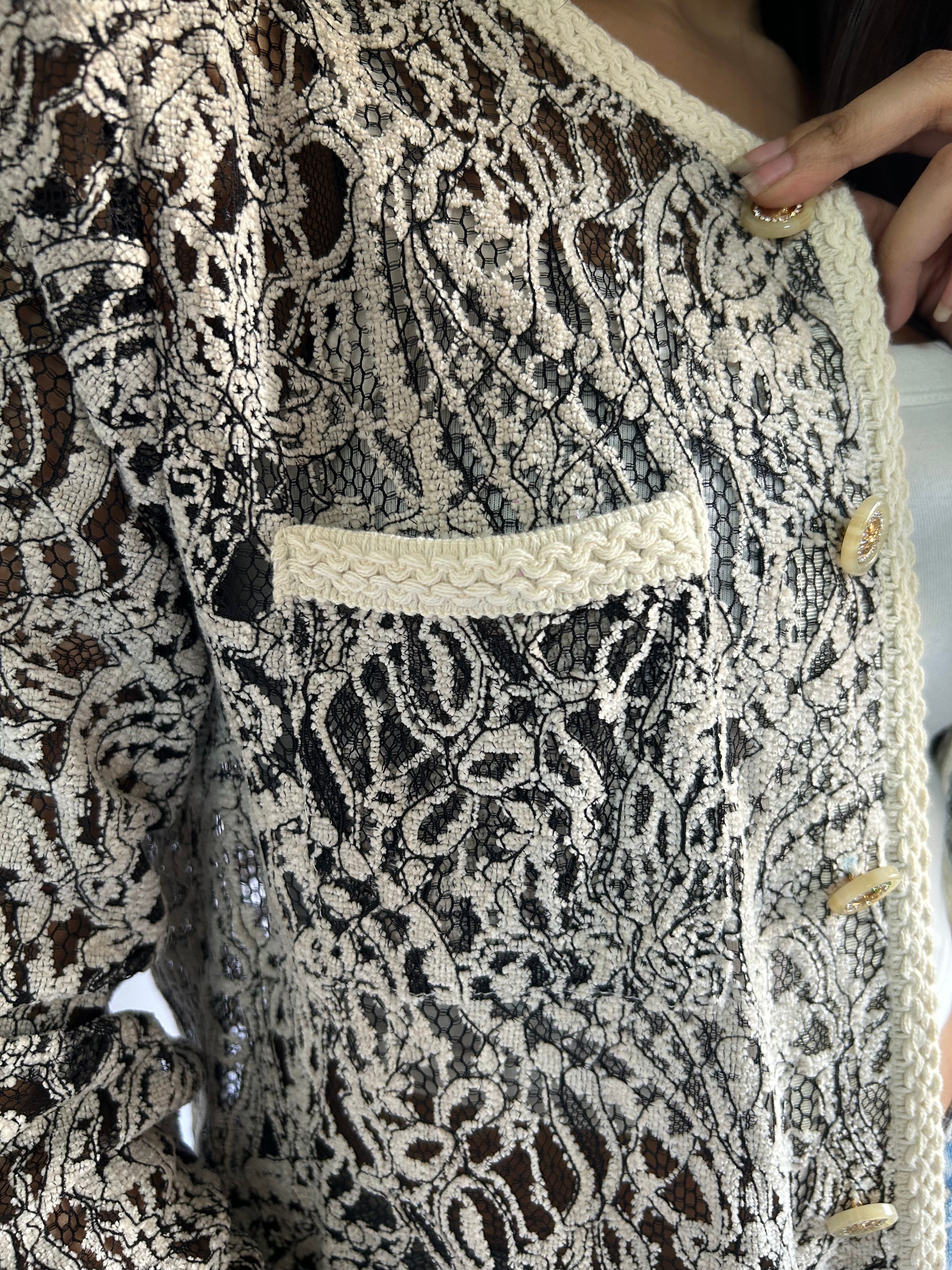 A modern take on classic elegance, this contrast lace jacket blends timeless craftsmanship with contemporary structure. Designed in an intricate black and ivory lace, it delivers striking visual depth while maintaining a refined, polished feel.