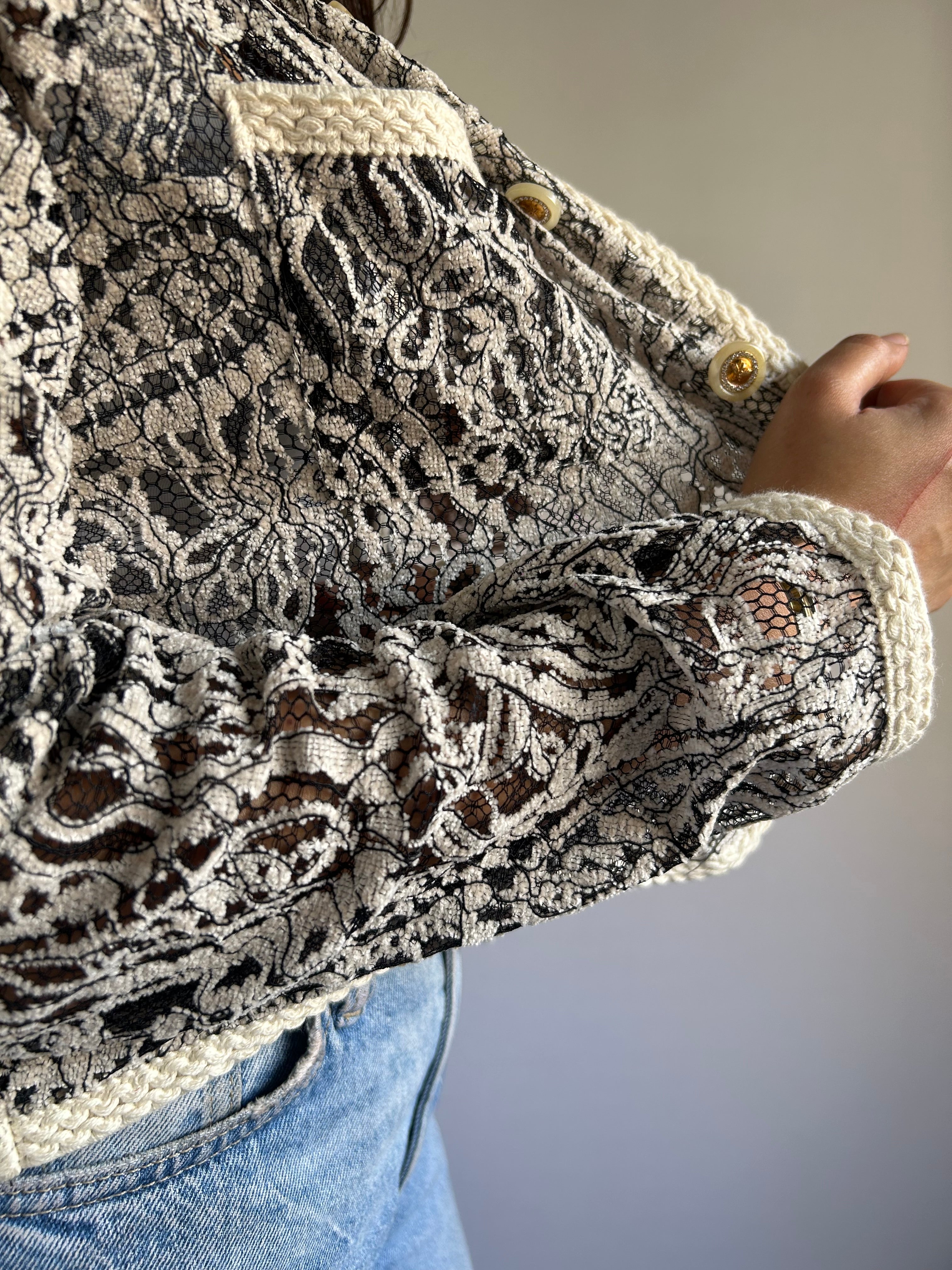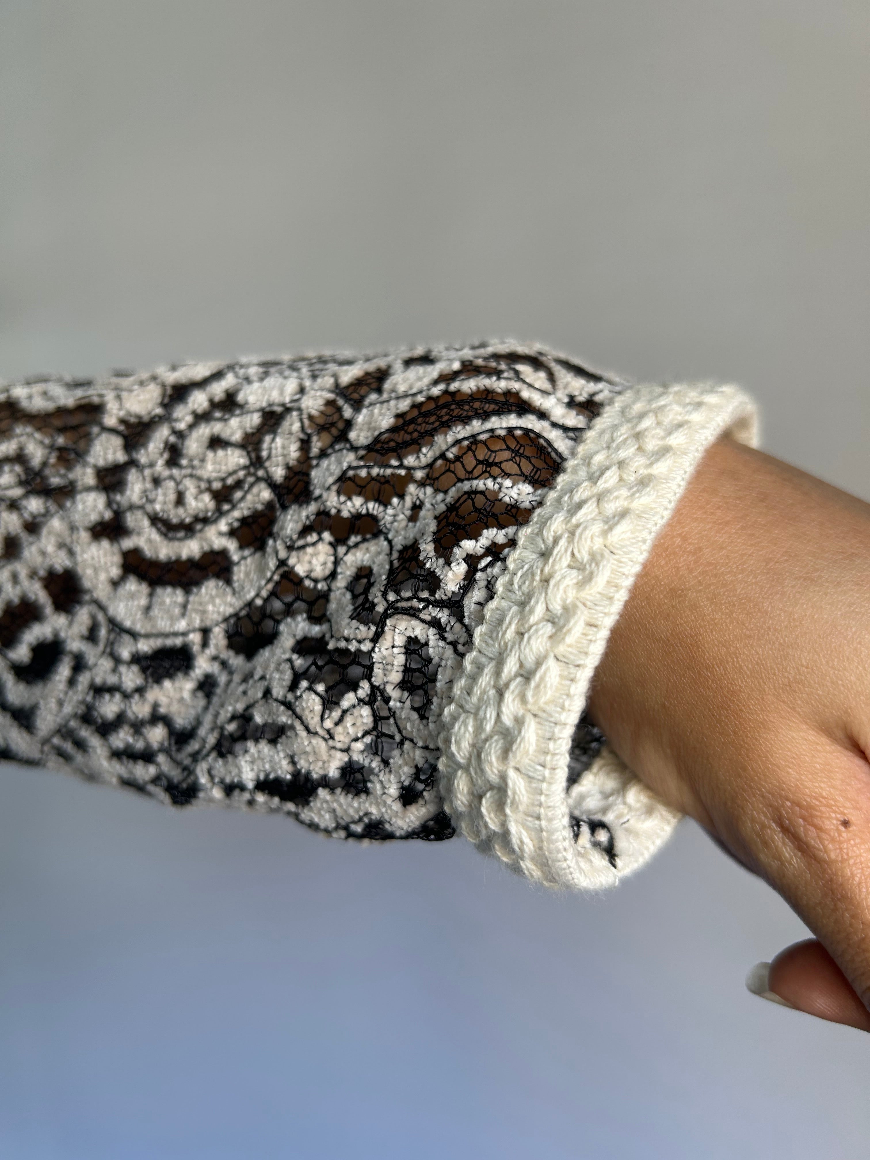 Elegantly finished with braided ivory-trim cuffs, the design adds a refined structure while beautifully complementing the intricate lace for a polished, sophisticated look.