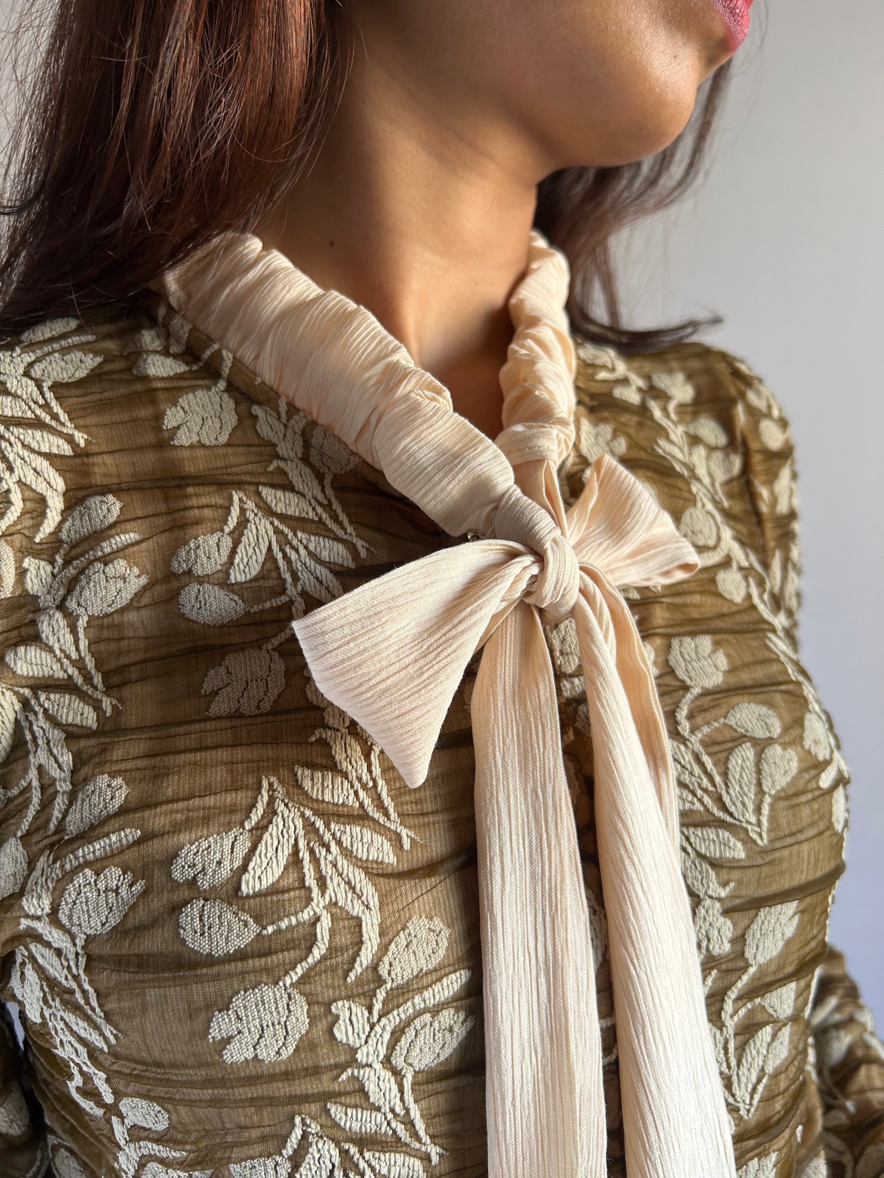 Step into understated elegance with the Golden Whisper Tie-Neck Top — a beautifully crafted piece that captures romance and refinement in every detail. Designed in a rich, earthy golden tone, this top showcases an intricate floral-textured overlay that adds depth, dimension, and quiet luxury to your look.
