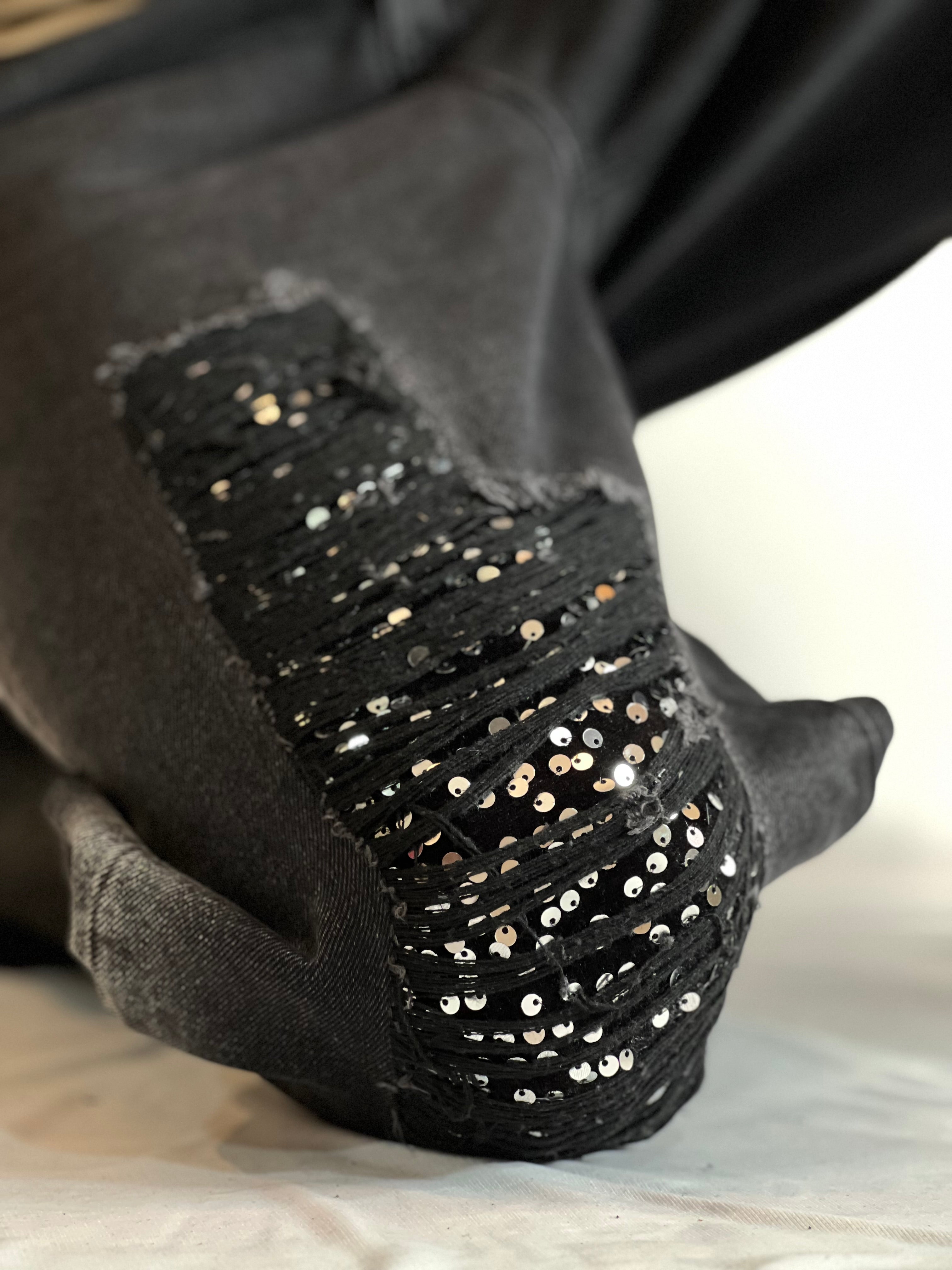 Designed to command attention, these luxury streetwear jeans merge raw distressing with elevated embellishment for a striking, fashion-forward finish. Rendered in a deep noir wash, the silhouette is defined by precision-crafted ripped panels layered over shimmering sequin detailing.Revealing subtle flashes of light with every movement.