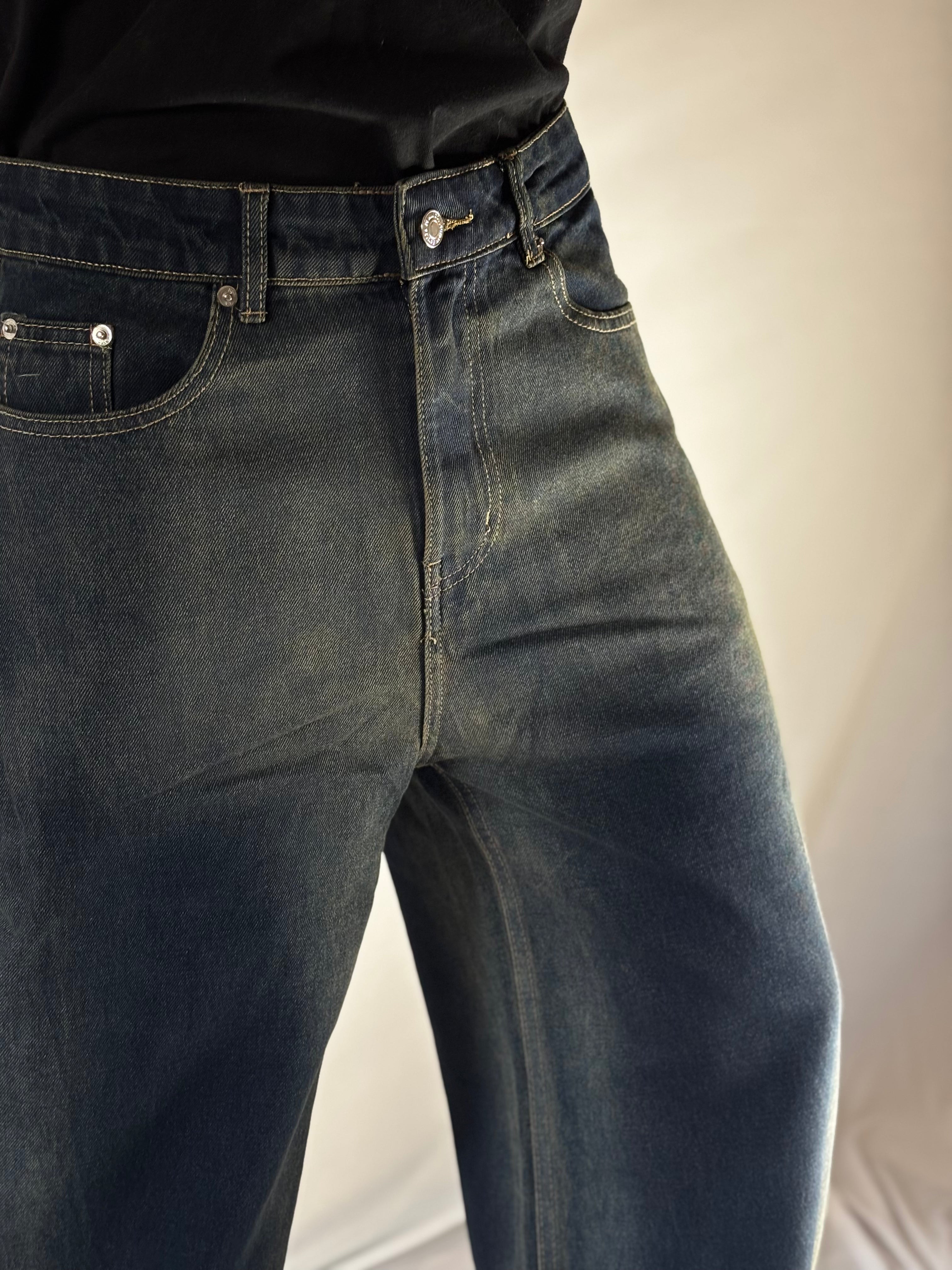 Relaxed-fit jeans crafted from structured cotton denim with a vintage-inspired faded wash. Designed with a mid-rise waist and a clean, elongated wide-leg silhouette that creates effortless movement and a modern edge